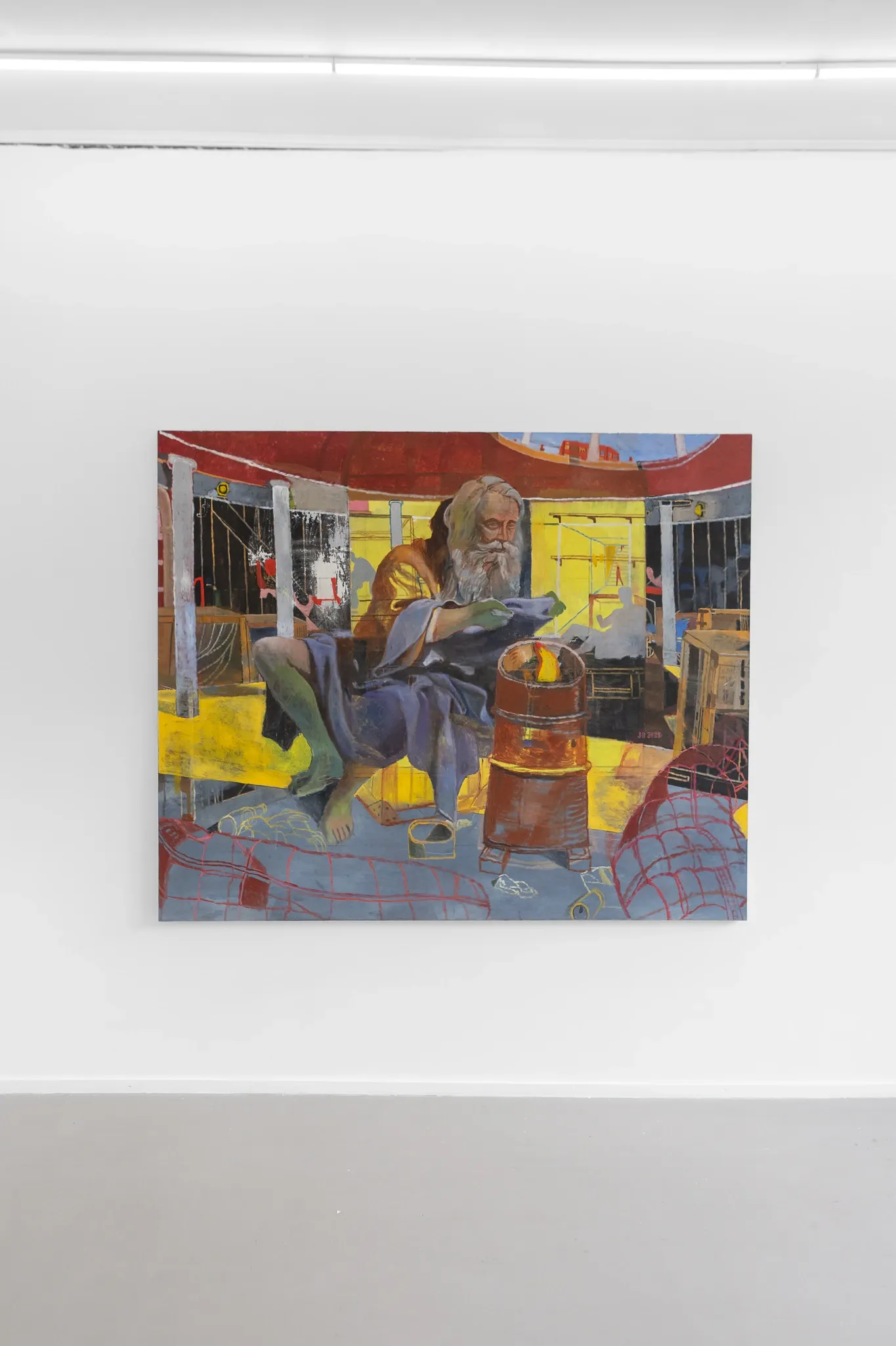 Jones offers his own version of Study for The Calling of Saint Matthew after Caravaggio’s work of the same name: with figures blurred almost to abstraction, the new picture feels remarkably like that of the old master, even if done in a very different style.