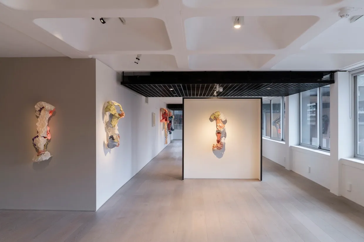 Benglis’s handmade paper, applied as pulp to chicken wire, emulates bones and flesh. Most engaging are her off-white works that almost – but not quite – resemble casts of the human body. In Frogman, Preborn and Cliff Dweller you are sure you can see a figure, but when you try to map it onto human anatomy, the correspondence eludes you.