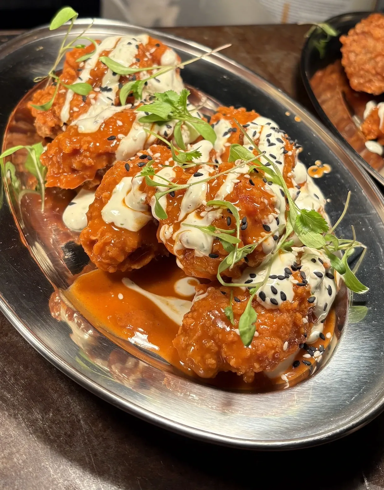 I started with a Maldon rock oyster in a jalapeño dressing — a salty palate cleanser. The award-winning peckalo wings are loaded with house ranch, sesame and micro coriander speckling; melt-off-the-bone, messy and marvellous. The cauli cheese might look more like a flat plate of raclette, but Gruyère and crispy breadcrumbs elevate the dish. The rotisserie potatoes are cooked in juicy, fatty goodness from the chicken.