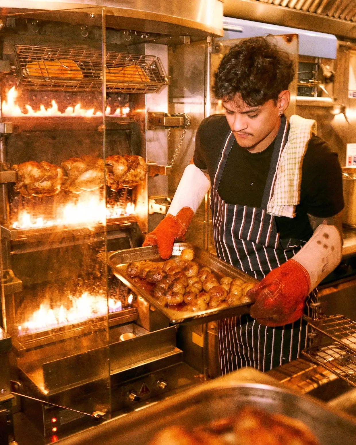 This is the “art of rotisserie”. Brined for four hours and perpetually spinning, the birds are roasted on a low heat and basted as they turn until truly juicy, then doused in imaginative glazes. The meat is then served filleted on ovoid silver plates. The classic rotisserie jus is reduced for 10 hours, but it’s the other sauces that really make the dishes sing.