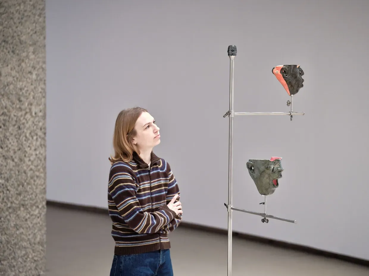 As a counterpoint to the unsettling sculptures, there are also more everyday works such as two faces singing in Harmonizer and Mediator III, a pair of chest-like forms facing a microphone.