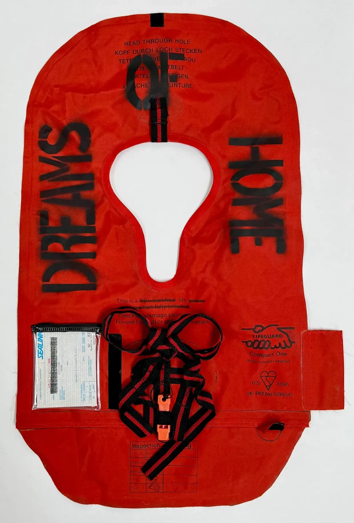 A sense of life on the edge of loss lingers in the gallery as I move toward the exit. The human condition is perhaps most succinctly summed up here in Life Vestments (2025), a display of red lifejackets with words stamped on them, including ‘HOME’, ‘DREAMS’ and ‘HOPE’. Are these the ideas that save us, or are they the last things we cherish as we drown?