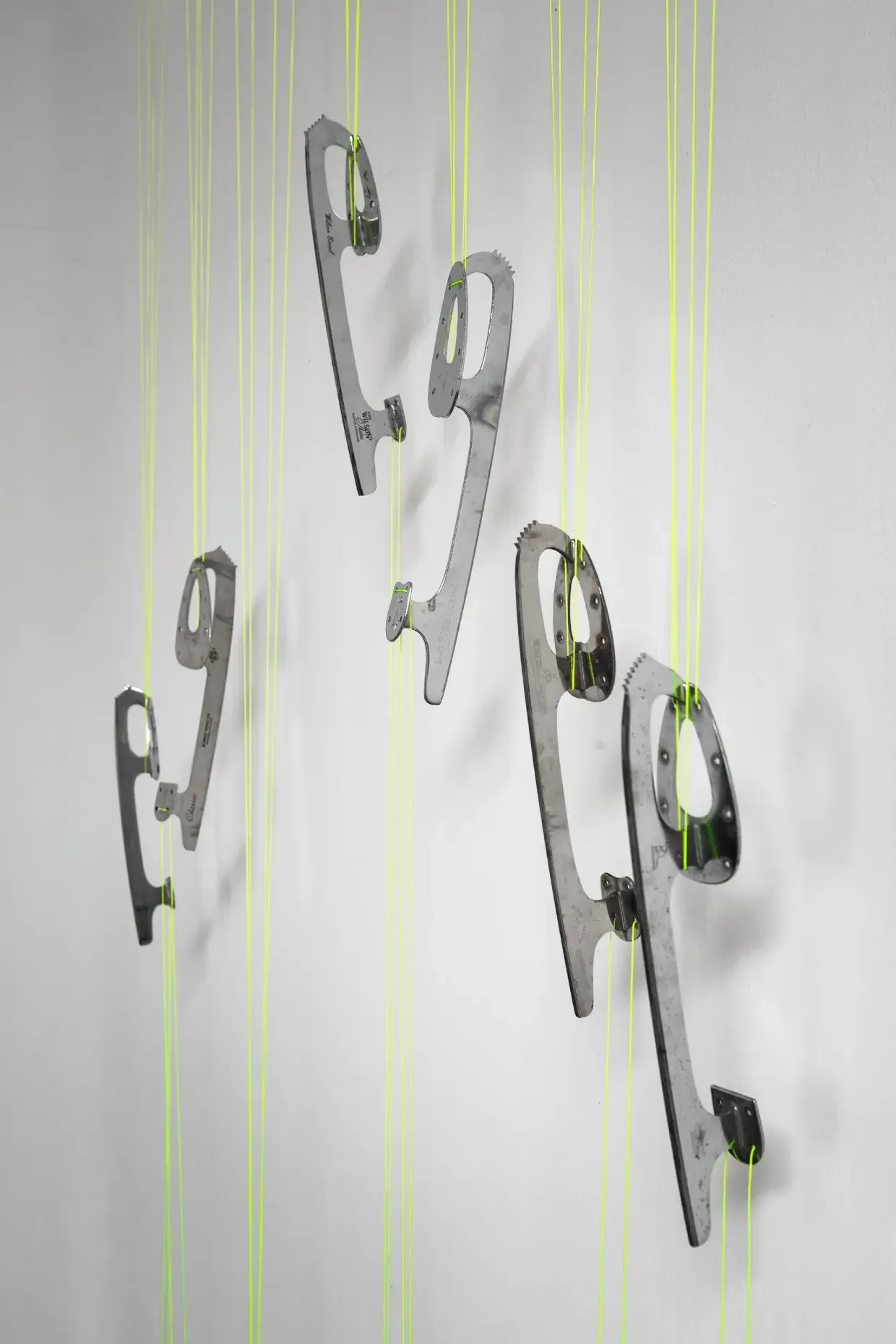 On one wall, Compulsory Figures (2026) is a group of ice-skate blades on cords which form a musical instrument that visitors can play by tapping the metal. Intrigued, I hear how skates sparked the idea behind the show when Dellow visited a flea market in south London and came across the possessions of a professional ice-skater called Joanne who had died. Joanne led her to think about the human condition: “I just felt this really strong connection for this stranger. It had her ice skates, it had one reel of super 8 footage, one reel of her practice skating music, and personal photographs. I did some more digging and I inhabited her as a character for a while. I recreated her costume, and I went back to the flea market dressed as Joanne and made a super 8 film out of it, and it really started as a prism to explore social and political ideas about ice and risk”.