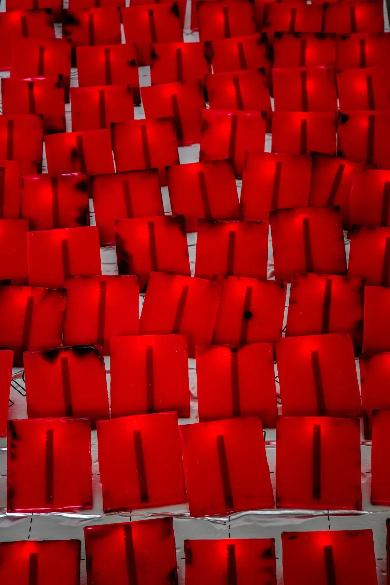 Her characterisation of her art as ‘experimental’ is apposite; I can certainly relate to the super 8 videos and the old photos, but I’m glad to have some of what I see interpreted. The rows of small red squares on a bed of shiny silver that make up The Glorious Dance (Your Ass Off) (2026) would have had me utterly baffled had Dellow not shown me that embedded in each square (of dental wax) is 18 frames of super 8 film of people dancing, with the 74 wax relics representing the lifespan of a human being.