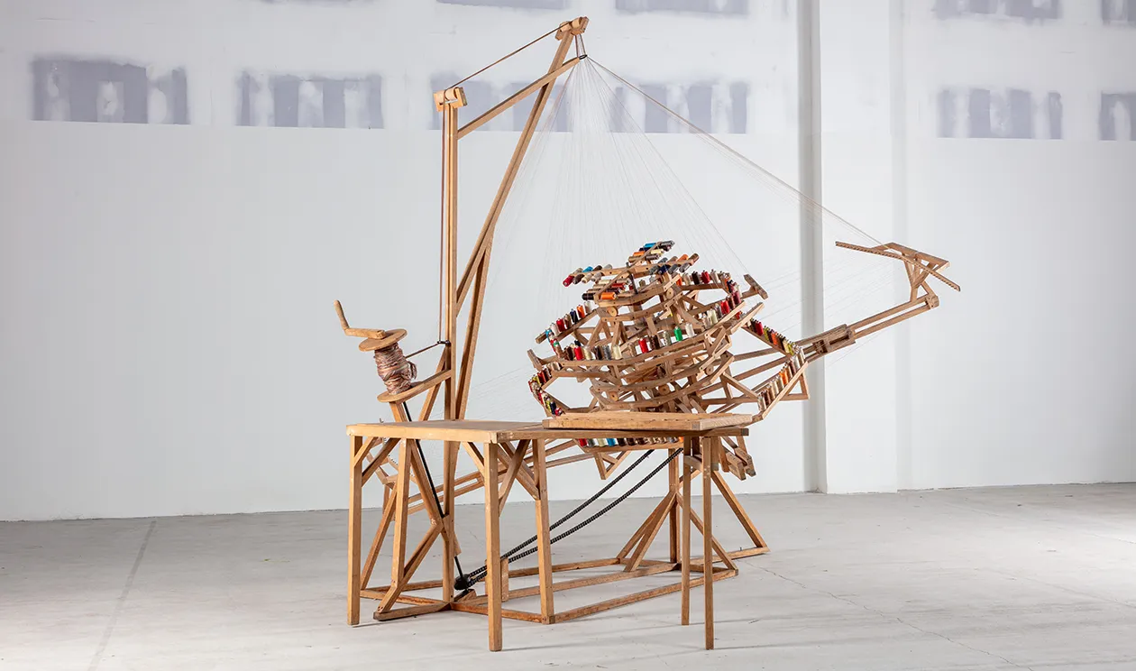 The giant machine, which has taken more than 10 years to develop, uses 40 interlocking arms to weave a cord from spools of yarn in a sequence of orbits that will never repeat.
